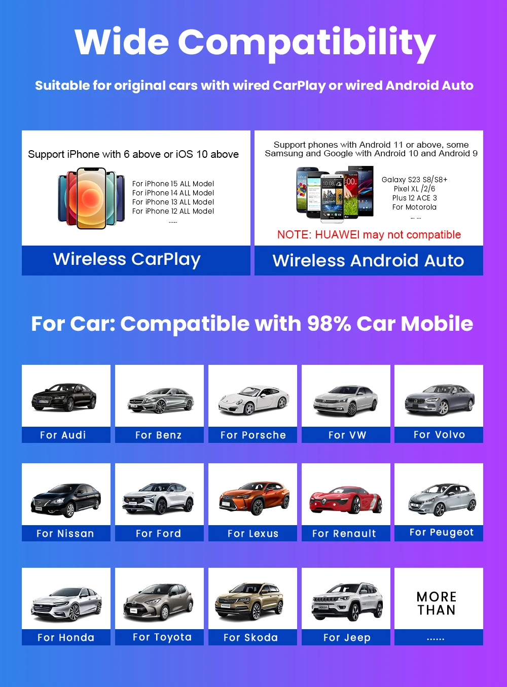✅ Funktioniert nur mit Fahrzeugen, die ab Werk (OEM) bereits kabelgebundenes Apple CarPlay oder Android Auto unterstützen.