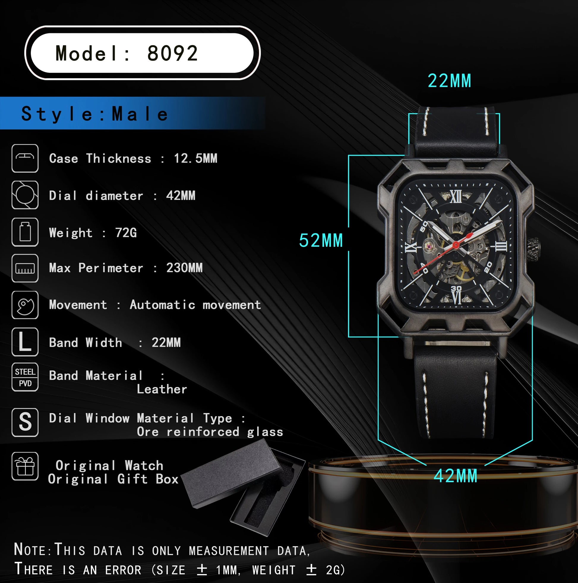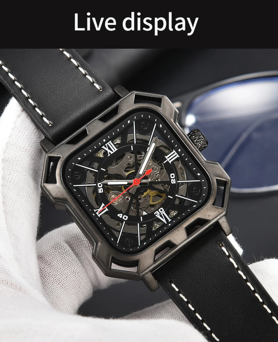 Das kantige, industrielle Gehäuse in mattem Schwarz sorgt für einen markanten Look, während das schwarze Echtlederarmband mit weißen Ziernähten einen edlen Kontrast schafft.